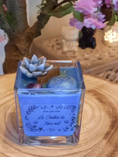 Bougie 230gr contenant une fiche explicative sur le chakra frontal, une pierre véritable (Améthyste), une sachet organza avec une spirale permettant d'insérer par la suite votre pierre et la porter en pendentif sur une chaîne.