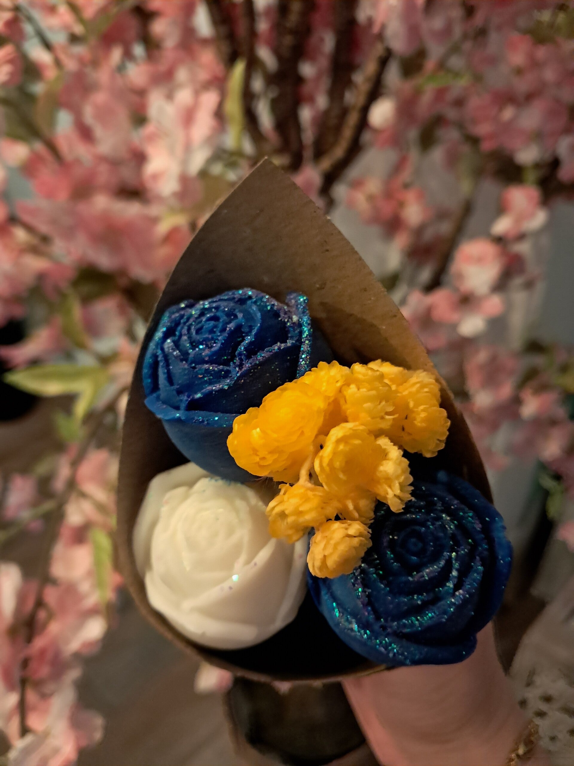 Petit bouquet de 3 fondants en forme de roses avec quelques fleurs séchées dans un cône en kraft avec étiquette "Merci de m'avoir aidé à grandir"
