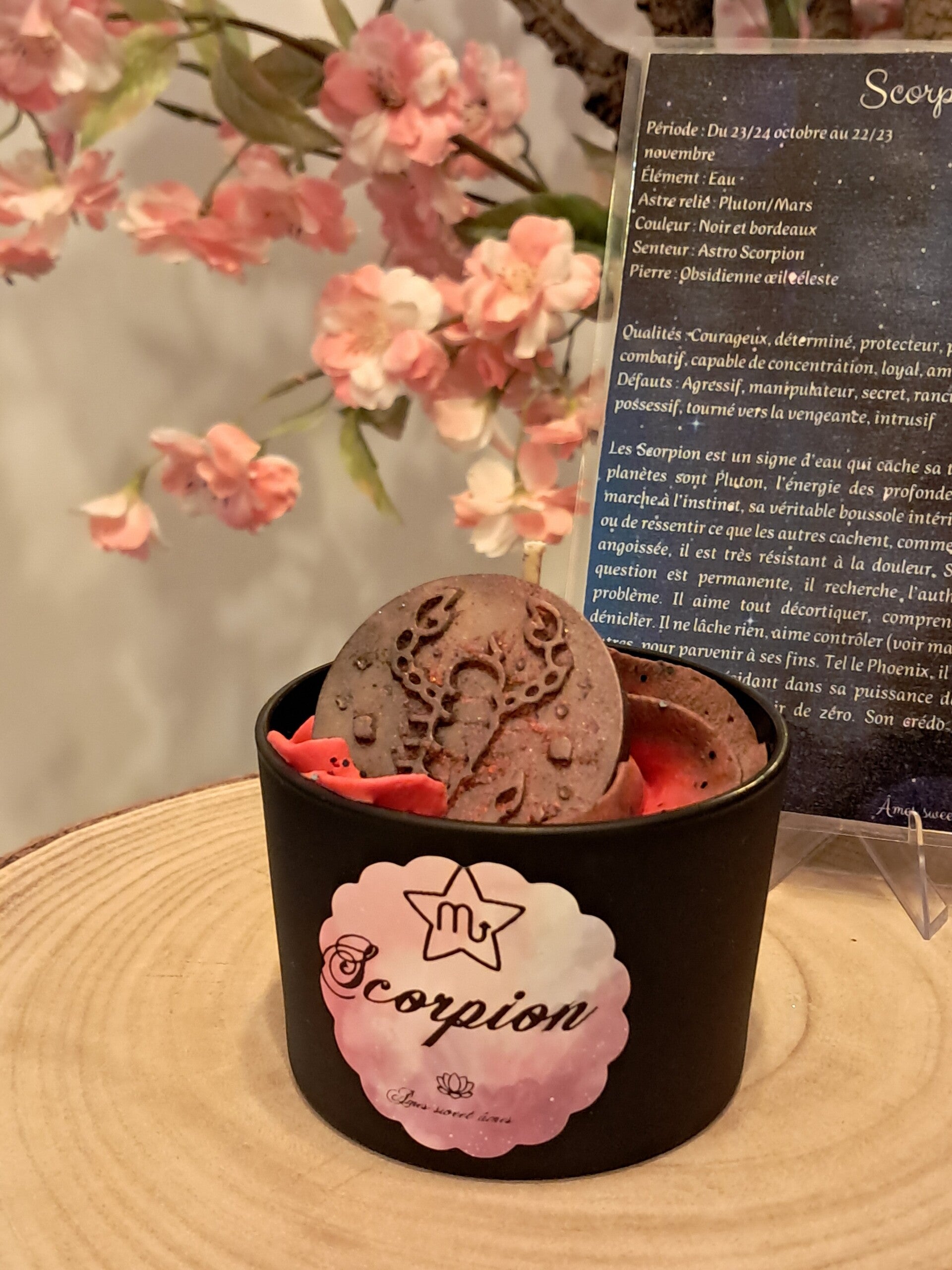 Bougie créée pour correspondre à l'énergie du Scorpion, sa senteur "Astro Scorpion", sa couleur: bordeaux et noir, et sa pierre" L obsidienne oeil céleste "
