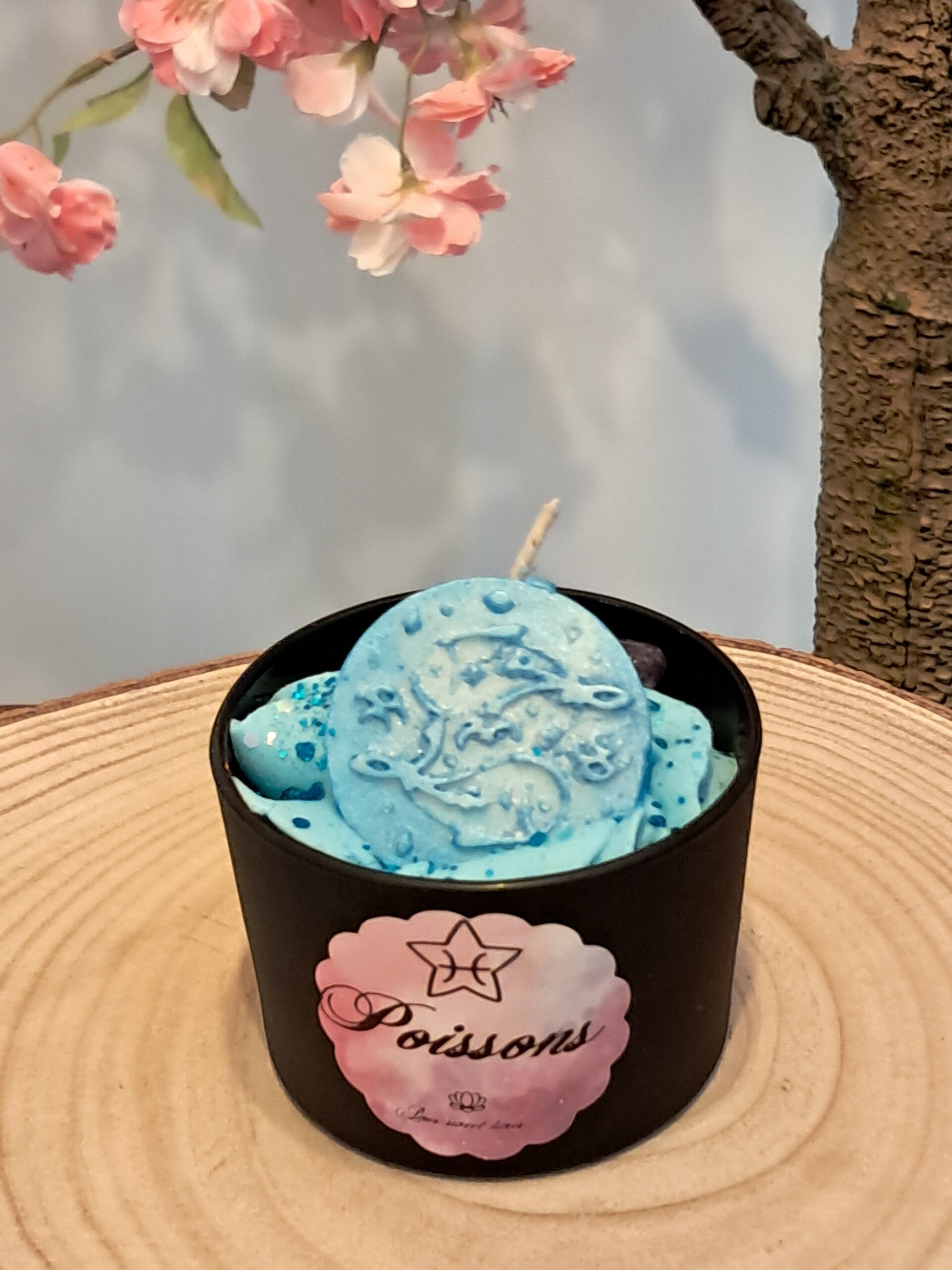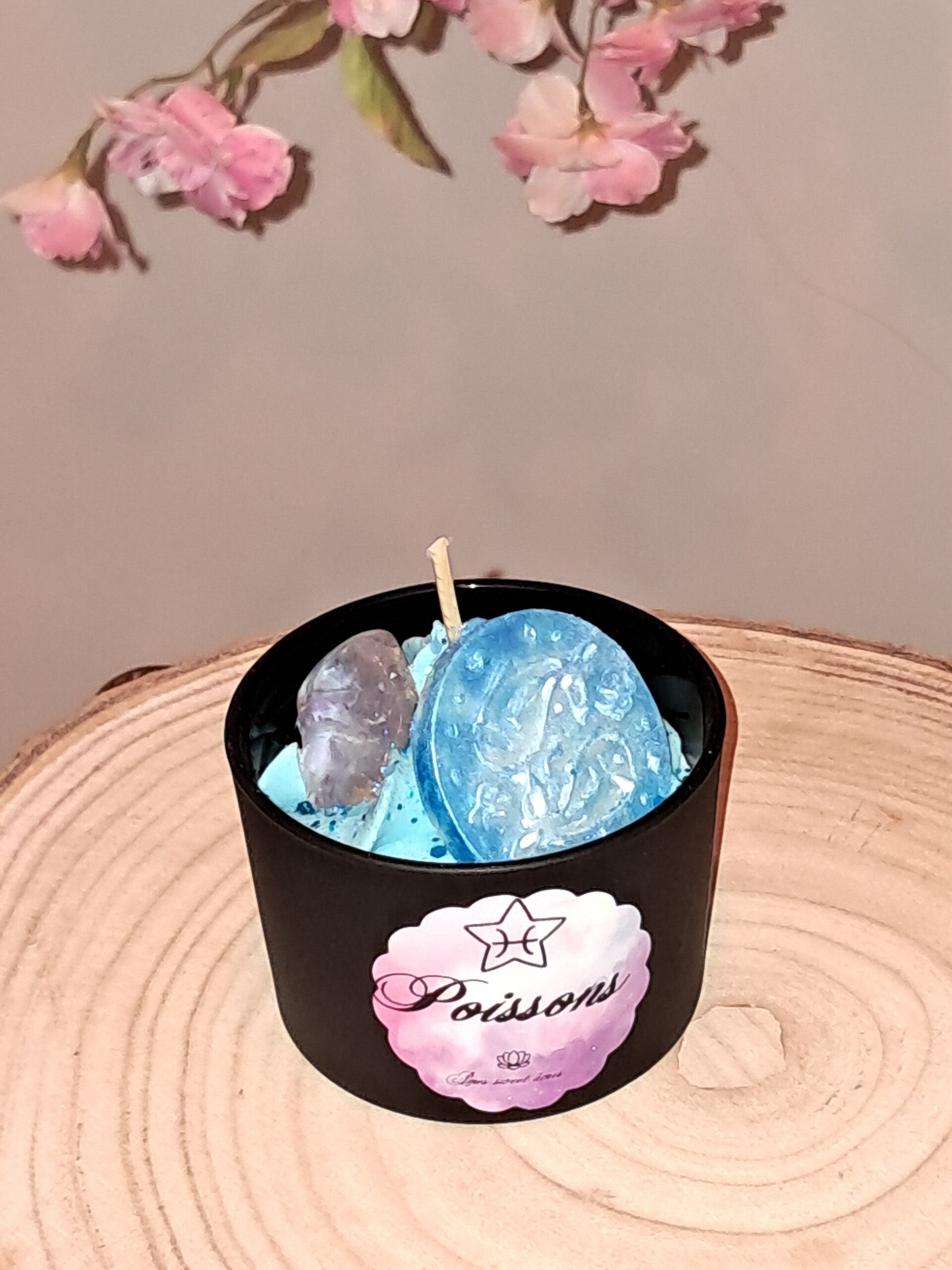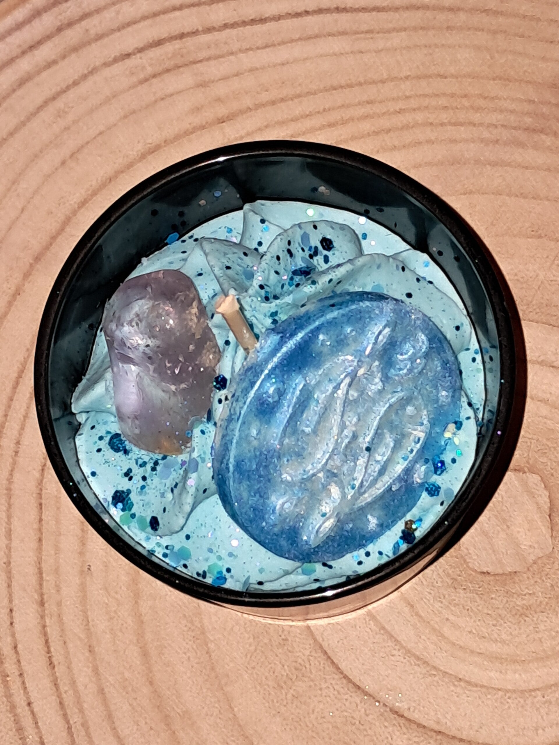 Bougie créée pour correspondre à l'énergie des Poissons, sa senteur "Astro Poissons", sa couleur: bleu turquoise, et sa pierre" L'améthyste "