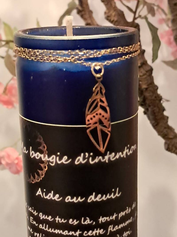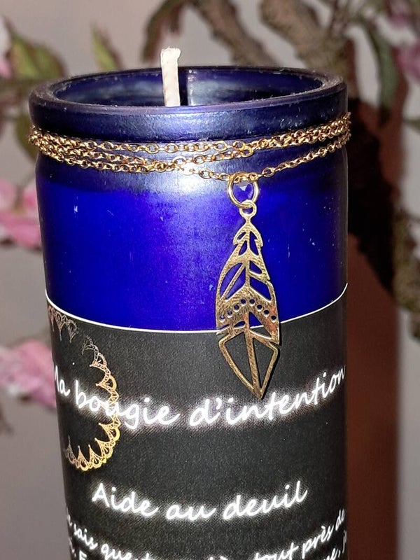 Comprenant une prière/ un mantra et un pendentif en acier inoxydable, ici une plume.